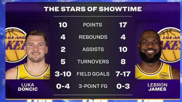 赛后,转播方晒出詹姆斯和东契奇本场的数据,东契奇伤退只打了16分钟10投3中,三分4中0仅得10分,出现5次失误;詹姆斯得到17分10助攻,但投篮17中7,三分3中0,还出现8次失误。